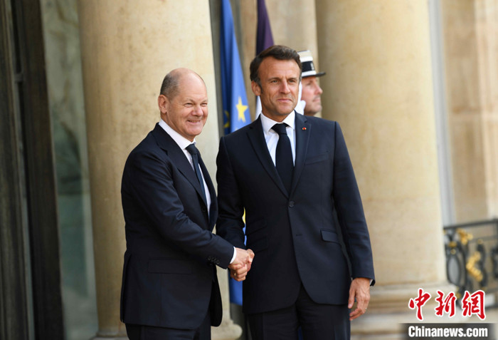 當?shù)貢r間6月12日晚,法國總統(tǒng)馬克龍在巴黎愛麗舍宮會見德國總理朔爾茨。朔爾茨前來出席當天舉行的法德波三國領(lǐng)導人會談。 中新社記者 李洋 攝