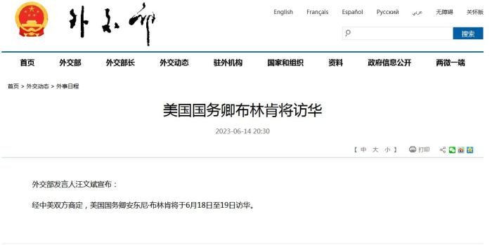 中新網(wǎng)6月14日電 據(jù)外交部網(wǎng)站消息,外交部發(fā)言人汪文斌宣布:經(jīng)中美雙方商定,美國國務(wù)卿安東尼·布林肯將于6月18日至19日訪華。