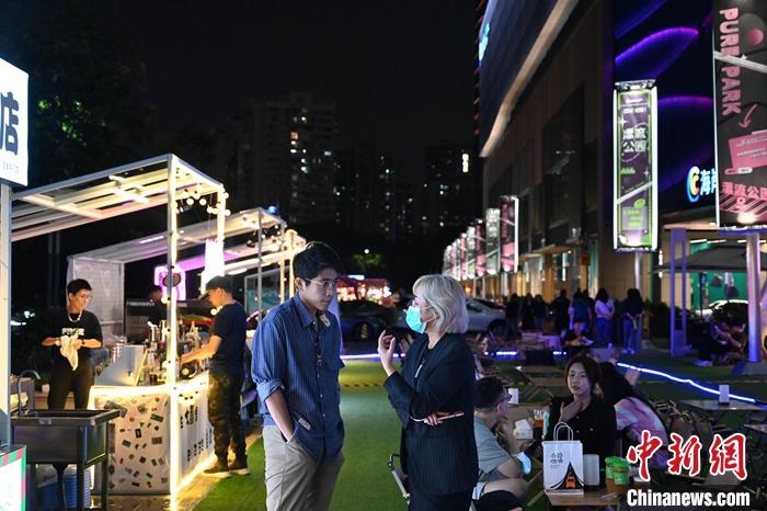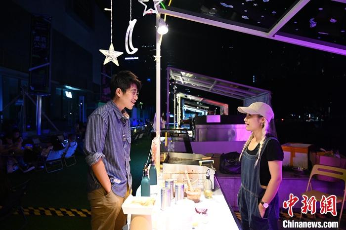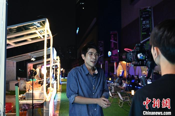 夜幕下的深圳市南山區(qū)人潮涌動,一處集合了美食、潮流、游戲等元素的市集內(nèi),臺灣青年周伯彥正與幾位工作人員一起檢查場地布置和物料擺放,為市集營業(yè)做最后的準(zhǔn)備。