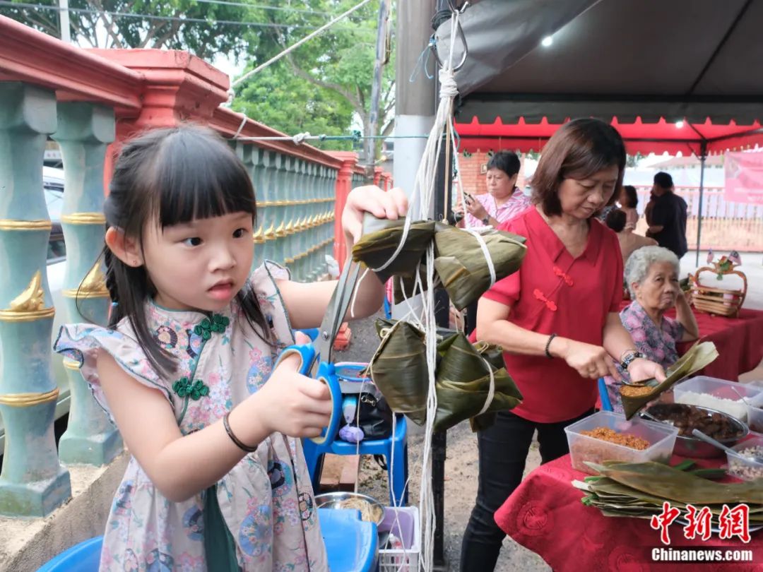 2023年6月18日,馬來西亞馬六甲舉行端午龍舟系列活動,包括游龍舟、裹粽比賽等,吸引當?shù)馗髯逡崦癖妳⑴c。圖為有的家庭四代同堂齊上陣。奶奶在一旁包粽子,四歲的曾馨怡小朋友給包好的粽子修剪粽葉。陳悅 攝