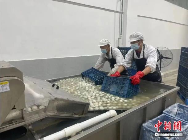 “公司現(xiàn)有鴨蛋加工生產(chǎn)線三、四條,單天產(chǎn)能達到20萬枚。此外還有15家農(nóng)戶和我們合作,以此來保證供應(yīng)量?!备哙]鴨集團生產(chǎn)管理部副部長陳菁說。