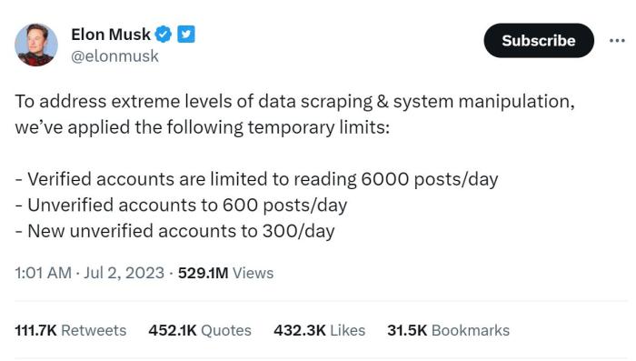 馬斯克發(fā)文稱,“為了解決極端水平的數據抓取和系統(tǒng)操縱問題,我們采取了以下臨時限制:認證帳戶每天只能閱讀6000個帖子,未認證的帳戶每天能看600個帖子;新的未認證的帳戶每天能看300個帖子?!?/p>