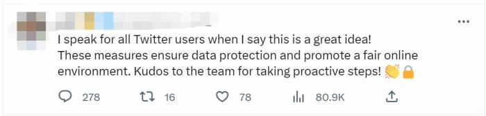 但也有網友對此表示歡迎,表示“我代表所有的推特用戶聲明,這是一個好主意!這些措施能確保數據得到保護,同時促進公平的網絡環(huán)境。感謝團隊采取積極措施?!?/p>