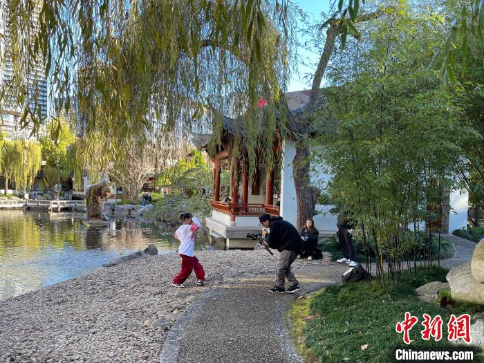 在湖邊,中國戲曲元素結(jié)合英文說唱的音樂吸引了游客們駐足。在悉尼從事汽修工作十余年的華人楊女士帶著兒子艾迪在湖邊拍攝音樂短視頻。穿著印有紅色京劇臉譜衛(wèi)衣的艾迪伴著動感音樂起舞。“我非常喜歡這里中西結(jié)合的感覺。希望在公共場合拍攝能培養(yǎng)孩子的自信心。”楊女士說。