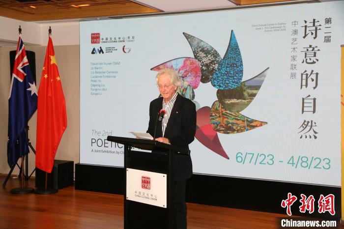 當(dāng)?shù)貢r(shí)間7月6日晚,第二屆“詩(shī)意的自然—中澳藝術(shù)家聯(lián)展”在悉尼開(kāi)幕。圖為澳大利亞水彩畫協(xié)會(huì)主席大衛(wèi)·范·紐恩在開(kāi)幕式上致辭。中新社記者 顧時(shí)宏 攝