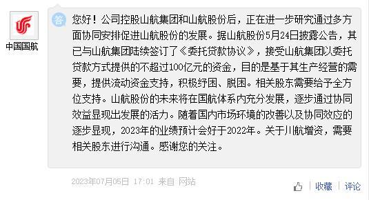 對(duì)于上述收購(gòu),中國(guó)國(guó)航于7月5日在投資者互動(dòng)平臺(tái)回應(yīng)稱(chēng),公司控股山航集團(tuán)和山航股份后,正在進(jìn)一步研究通過(guò)多方面協(xié)同安排促進(jìn)山航股份的發(fā)展。