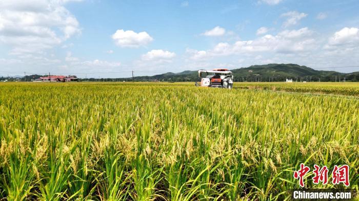 中新網(wǎng)福建長(zhǎng)汀7月17日電 (朱芳彬 丘偉華)眼下,位于福建省龍巖市長(zhǎng)汀縣河田鎮(zhèn)的遠(yuǎn)豐優(yōu)質(zhì)稻生產(chǎn)基地又迎來(lái)豐收,基地里的水稻陸續(xù)成熟進(jìn)入收割期,機(jī)械化按下開鐮收割夏收“快進(jìn)鍵”。