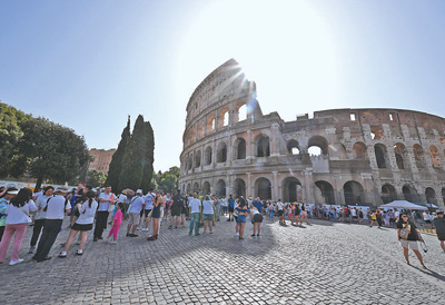 意大利首都羅馬7月18日最高氣溫超過41攝氏度,是今年以來當(dāng)?shù)刈罡邭鉁亍D為當(dāng)天,游客聚集在羅馬斗獸場附近。