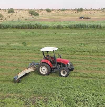 在中國(guó)援毛里塔尼亞畜牧業(yè)技術(shù)示范中心,工作人員操作機(jī)械收割紫花苜蓿。