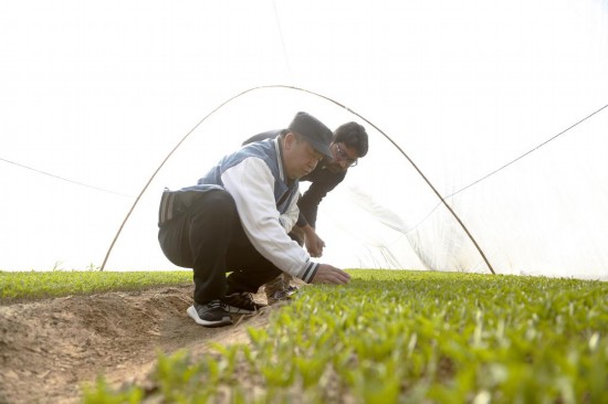 巴基斯坦旁遮普省木爾坦的中巴辣椒訂單種植項(xiàng)目辣椒育苗大棚內(nèi),中國農(nóng)業(yè)專家?guī)ьI(lǐng)巴基斯坦技術(shù)員查看辣椒秧苗生長(zhǎng)情況。
