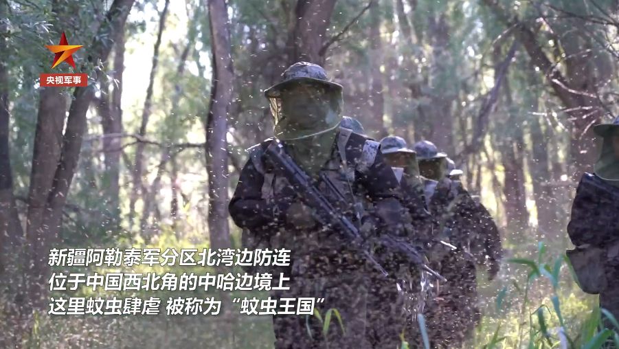 新疆阿勒泰軍分區(qū)北灣邊防戰(zhàn)士穿行蚊子群巡邏。一路上數(shù)以萬(wàn)計(jì)的蚊子、蠓蟲(chóng)撲面而來(lái)。圖片來(lái)源:央視軍事視頻截圖