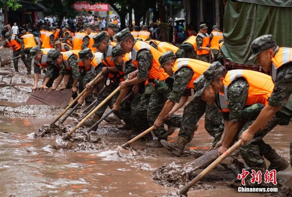 2023年7月4日,重慶市萬(wàn)州區(qū)五橋河河水猛漲,武警重慶總隊(duì)執(zhí)勤第三支隊(duì)官兵在清理街道淤泥。