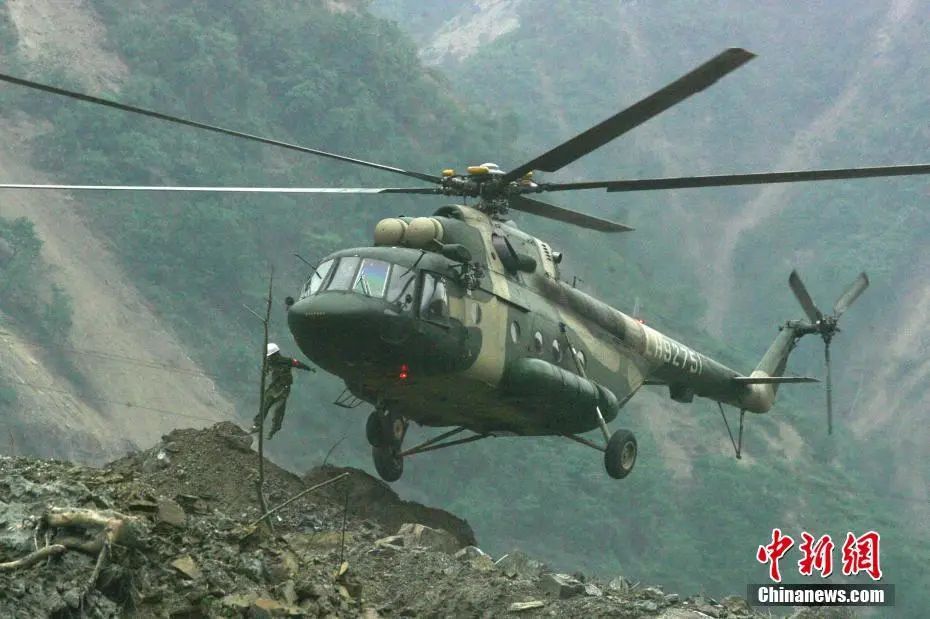 2008年5月20日,成都軍區(qū)陸航團(tuán)姜廣偉王牌直升機(jī)組上午十時(shí)以單輪首次成功強(qiáng)降北川重災(zāi)區(qū)“定時(shí)炸彈”——堰塞湖無(wú)名塌方小土堆上。中新社記者 賈國(guó)榮 攝