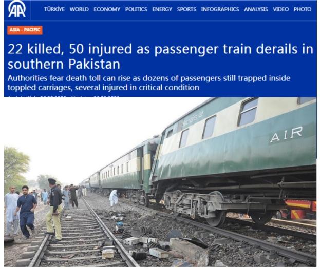 據(jù)報道,一名巴基斯坦南部信德省官員稱,當(dāng)天,從卡拉奇開往哈維連的一列客運(yùn)火車在信德省桑克爾地區(qū)附近脫軌,有至少10節(jié)車廂沖出軌道。