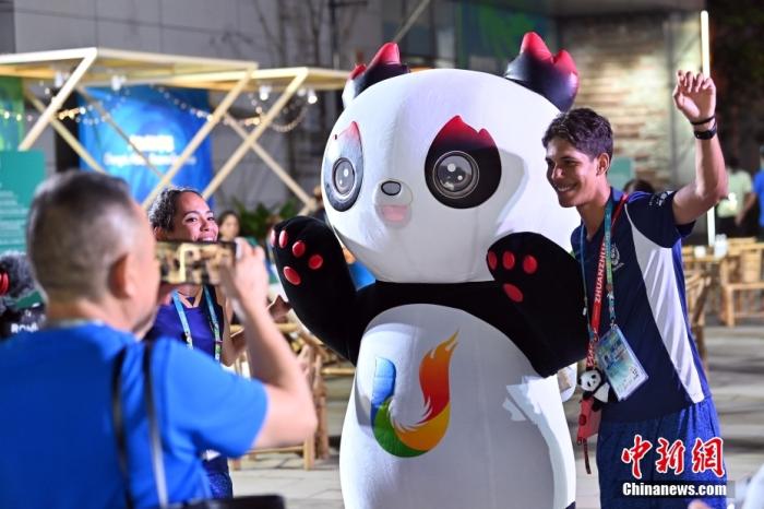 資料圖:參賽運動員在大運村與“蓉寶”合影。中新社記者 九美旦增 攝