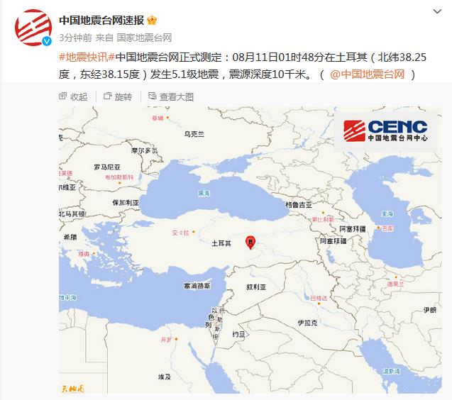 中新網(wǎng)8月11日電 據(jù)國家地震臺(tái)網(wǎng)官方微博消息,中國地震臺(tái)網(wǎng)正式測(cè)定:8月11日01時(shí)48分在土耳其(北緯38.25度,東經(jīng)38.15度)發(fā)生5.1級(jí)地震,震源深度10千米。