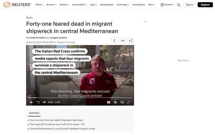 路透社報道稱,地中海中部是世界上最危險的移民路線之一。據(jù)國際移民組織稱,自2014年以來,已有超過22000人在該海域死亡或失蹤。