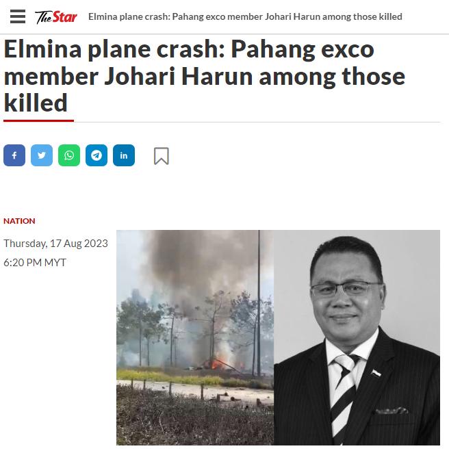 中新網(wǎng)8月17日電 據(jù)馬來西亞《星州日?qǐng)?bào)》援引警方消息稱,當(dāng)?shù)貢r(shí)間17日,馬來西亞雪蘭莪州發(fā)生墜機(jī)事故,造成至少10人死亡,其中一名死者為該國彭亨州行政議員喬哈里·哈倫。