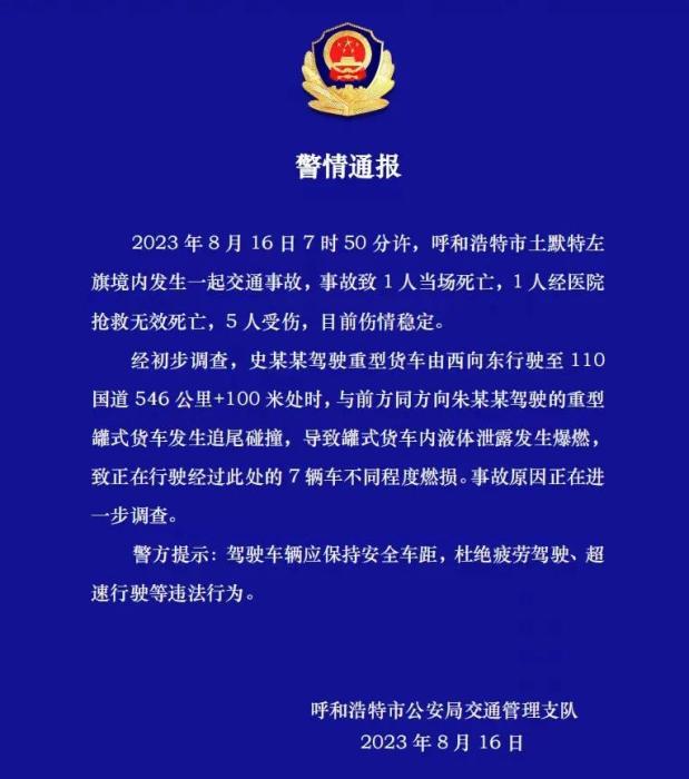 經初步調查,史某某駕駛重型貨車由西向東行駛至110國道546公里+100米處時,與前方同方向朱某某駕駛的重型罐式貨車發(fā)生追尾碰撞,導致罐式貨車內液體泄露發(fā)生爆燃,致正在行駛經過此處的7輛車不同程度燃損。事故原因正在進一步調查。