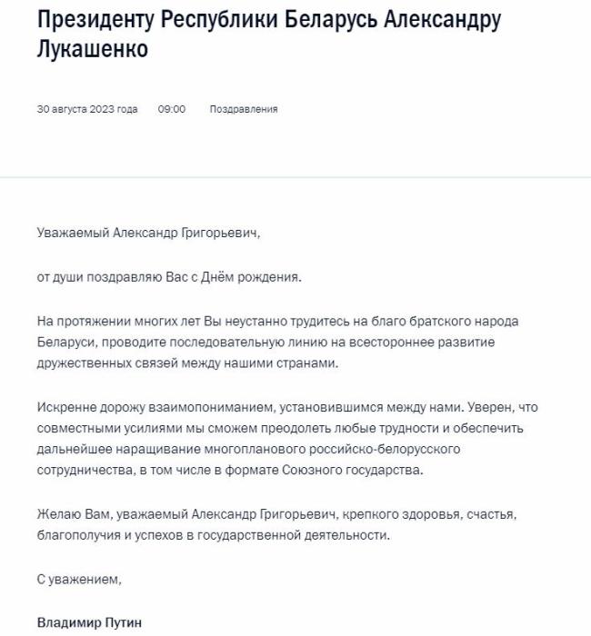 據(jù)報(bào)道,克里姆林宮網(wǎng)站發(fā)布了生日賀電內(nèi)容。賀電中稱,多年來(lái),盧卡申科一直為白俄羅斯的人民利益不懈努力。普京表示真誠(chéng)珍視同白俄羅斯的互信關(guān)系。