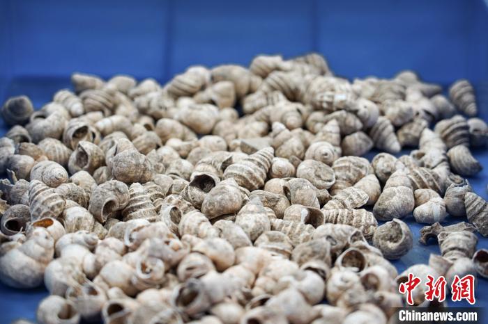 圖為柳州白蓮洞穴科學(xué)博物館庫(kù)房?jī)?nèi)的螺螄殼化石。韋國(guó)政 攝