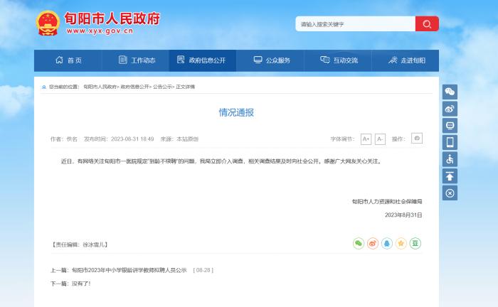 8月31日,據(jù)旬陽(yáng)市人民政府網(wǎng)站發(fā)布情況通報(bào),旬陽(yáng)市人力資源和社會(huì)保障局已對(duì)此介入調(diào)查,相關(guān)調(diào)查結(jié)果及時(shí)向社會(huì)公開(kāi)。