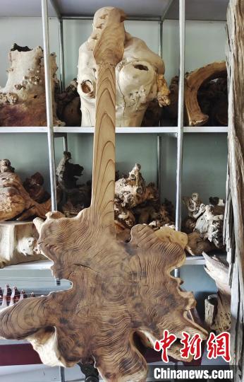 52歲的戴新是新疆生產建設兵團第一師十團苗木基地的技工,因長年癡迷于根雕藝術,依靠當?shù)囟鄻拥牧謽I(yè)資源制作各類根雕,不僅建起根雕廠,還利用閑置的房屋,分門別類設立了多間根雕展示廳。