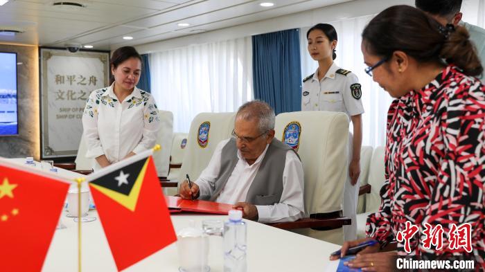 9月3日上午,正在執(zhí)行“和諧使命-2023”任務(wù)的中國海軍“和平方舟”號醫(yī)院船抵達(dá)東帝汶帝力港,開始為期7天的友好訪問和醫(yī)療服務(wù)。圖為東帝汶總統(tǒng)奧爾塔在醫(yī)院船簽名簿上留言。黎宇 攝