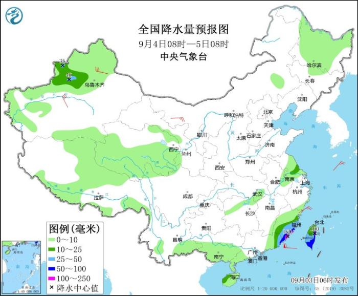 9月4日08時至5日08時,新疆沿天山地區(qū)和伊犁河谷、福建東南部、廣東東部、海南島西北部、臺灣島等地部分地區(qū)有中到大雨,其中,福建東南部沿海地區(qū)、廣東東南部沿海、臺灣島東部等地部分地區(qū)有暴雨或大暴雨(100~160毫米)。內蒙古西北部、新疆南疆盆地、福建東部沿海等地部分地區(qū)有5~7級風。東海南部、臺灣以東洋面、臺灣海峽、巴士海峽、南海東北部有6~8級大風、陣風10~11級,其中臺灣以東洋面、臺灣海峽、巴士海峽北部、南海東北部部分海域風力可達9~11級、陣風13~14級。