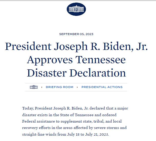 美國總統(tǒng)拜登批準田納西州重大災難聲明