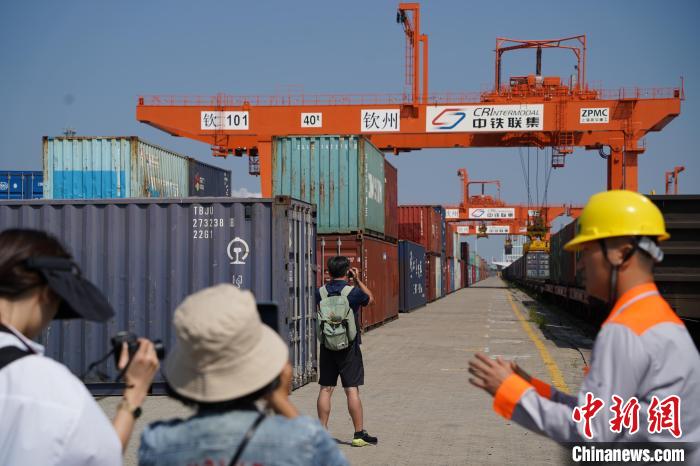 5日,“走進壯美廣西·探尋向海之美”兩岸媒體人聯(lián)合采訪活動來到位于廣西欽州的欽州鐵路集裝箱中心站和北部灣港欽州自動化集裝箱碼頭。作為西部陸海新通道的重要節(jié)點,欽州的樞紐通道優(yōu)勢越發(fā)凸顯。在鐵海聯(lián)運新模式下,來自泰國、新加坡等“一帶一路”沿線國家和中國西部地區(qū)的貨物在這里實現(xiàn)“下船即上車,下車即上船”。