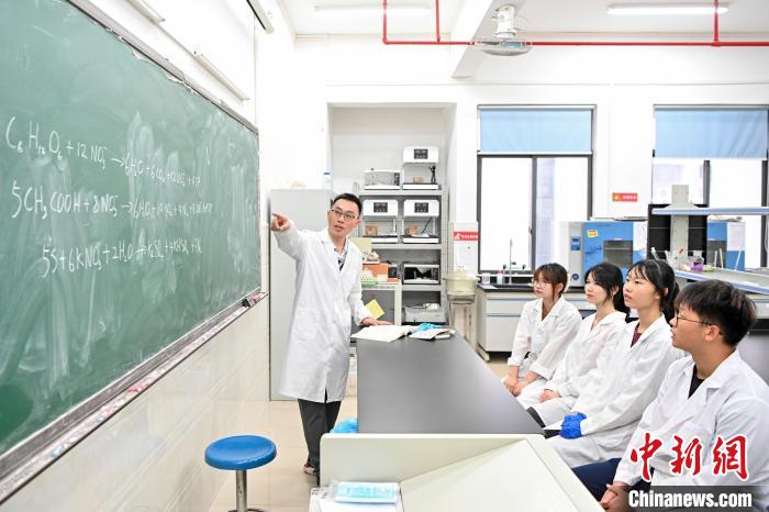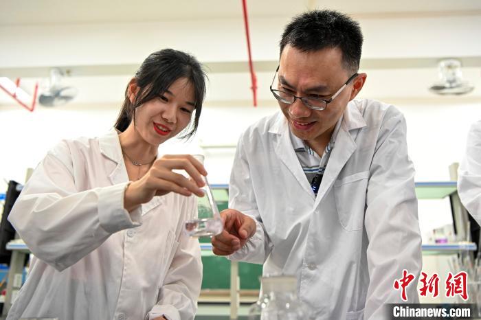 今年6月底,臺灣教師黃崇輔(右)在肇慶學(xué)院指導(dǎo)學(xué)生做實驗。中新社記者 陳驥旻 攝