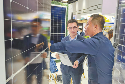 在一家中國(guó)科技公司展位上,參觀者在討論光伏組件參數(shù)。