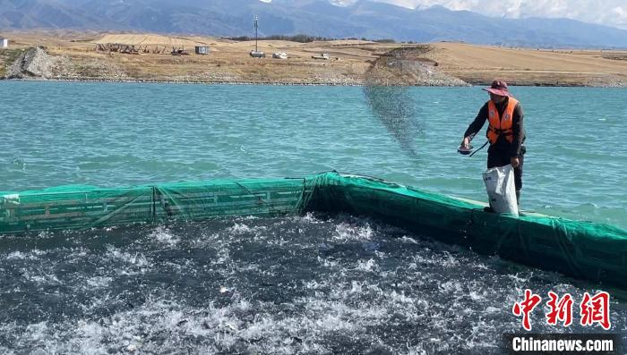 9月9日,記者來到位于新疆伊犁尼勒克縣喀拉蘇鄉(xiāng)的三文魚養(yǎng)殖基地。圖為養(yǎng)殖工向網(wǎng)箱中的虹鱒魚拋撒餌料。中新社記者 朱賀 攝
