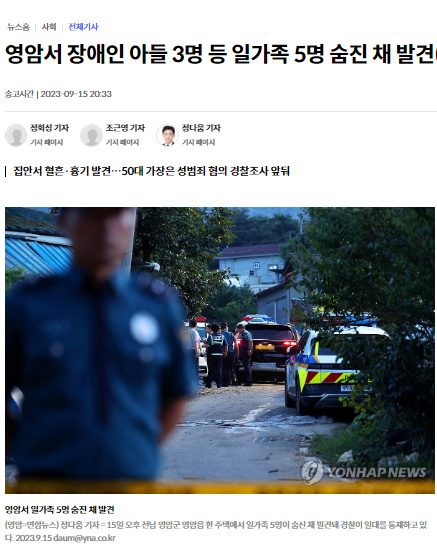 中新網(wǎng)9月15日電 據(jù)韓聯(lián)社報(bào)道,當(dāng)?shù)貢r(shí)間15日下午,韓國(guó)全羅南道靈巖郡一家五口在家中同時(shí)身亡,現(xiàn)場(chǎng)到處都是血跡。