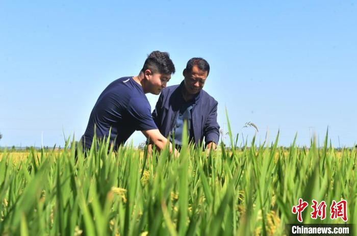 金秋時(shí)節(jié),臺(tái)胞林駿睿(左)與吉林農(nóng)民楊萬芳在稻田里觀察水稻。 高龍安 攝