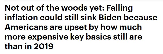 報(bào)道援引美國(guó)數(shù)字新聞網(wǎng)站(Axios)的民調(diào)稱,美國(guó)民眾對(duì)本國(guó)經(jīng)濟(jì)的看法十分糟糕。這其中很重要的原因就是,民眾在日常生活中更關(guān)注所需商品的絕對(duì)價(jià)格,而這一價(jià)格目前依然過(guò)高。盡管近期美國(guó)通脹率有所下降,但商品價(jià)格還在上漲,只是比以前稍慢了一些。