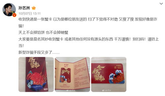 10月7日,演員孫藝洲在微博發(fā)文稱,“收到快遞是一張蟹卡,以為是哪位朋友送的。掃了下覺得不對(duì)勁,又搜了搜。發(fā)現(xiàn)好像是詐騙!天上不會(huì)掉餡餅,也不會(huì)掉螃蟹。大家要是莫名其妙收到蟹卡,或者其他任何沒有源頭的東西,千萬謹(jǐn)慎!別掃碼!謹(jǐn)防上當(dāng)!新型詐騙手段又多了……”