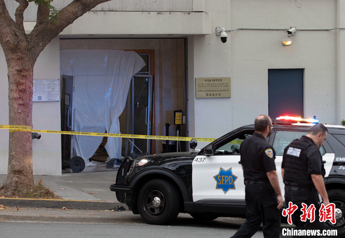 當(dāng)?shù)貢r(shí)間10月9日,美國(guó)舊金山警方在中國(guó)駐舊金山總領(lǐng)館附近對(duì)總領(lǐng)館館舍遭沖闖襲擊事件展開調(diào)查。中國(guó)駐舊金山總領(lǐng)館發(fā)言人表示,9日下午,有不明身份人員駕車暴力沖撞闖入中國(guó)駐舊金山總領(lǐng)館證件大廳,對(duì)工作人員及現(xiàn)場(chǎng)民眾生命安全構(gòu)成嚴(yán)重威脅,對(duì)總領(lǐng)館設(shè)施與財(cái)產(chǎn)造成嚴(yán)重破壞,性質(zhì)極其惡劣。 中新社記者 劉關(guān)關(guān) 攝