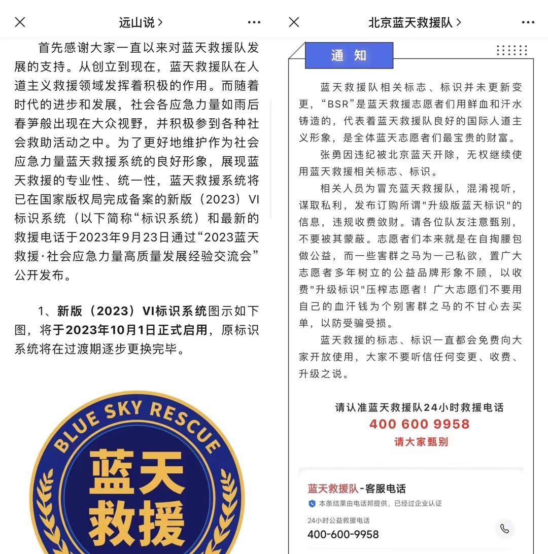 中新網(wǎng)注意到,今年9月30日,張勇在“遠(yuǎn)山說”公眾號上發(fā)布了《藍(lán)天救援關(guān)于更換VI標(biāo)識系統(tǒng)、救援電話的公告》,稱將于2023年10月1日正式啟用。就在啟用當(dāng)天,北京藍(lán)天救援隊(duì)公眾號發(fā)布信息稱“藍(lán)天救援隊(duì)相關(guān)標(biāo)志、標(biāo)識并未更新變更。不要聽信任何變更、收費(fèi)、升級之說。”