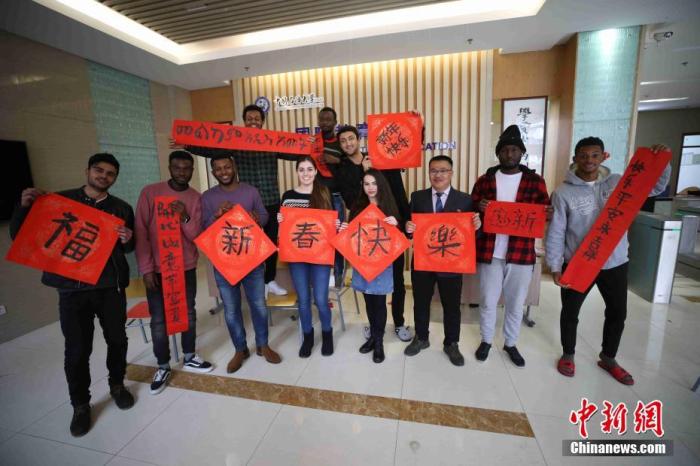 資料圖:2019年2月3日是中國農歷臘月二十九,“春節(jié)”將至,來自巴基斯坦、烏茲別克斯坦、烏克蘭等國家和地區(qū)的十余名中國石油大學的留學生在青島歡聚一堂,一起寫“春聯(lián)”、題“?!弊?、貼“窗花”,感受中華文化。中新社記者 胡耀杰 攝