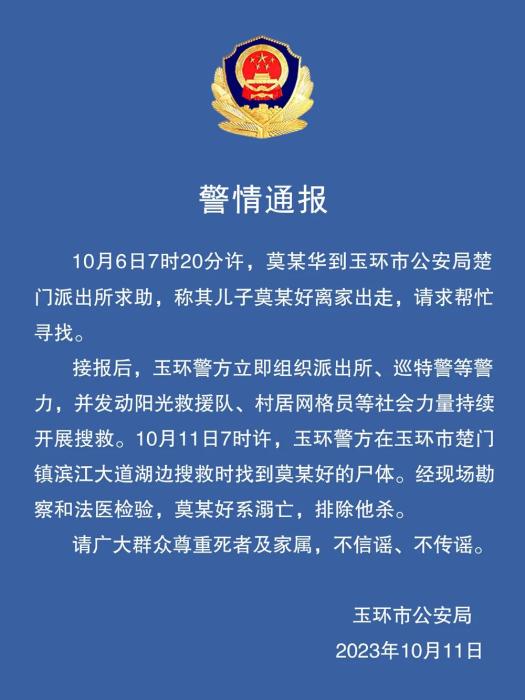 中新網(wǎng)10月11日電 浙江省玉環(huán)市公安局11日在其官方微信發(fā)布警情通報(bào)稱,10月6日7時(shí)20分許,莫某華到玉環(huán)市公安局楚門派出所求助,稱其兒子莫某好離家出走,請求幫忙尋找。