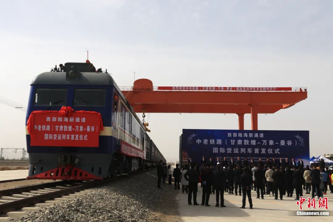 首趟西部陸海新通道中老鐵路(甘肅敦煌-萬(wàn)象-曼谷)國(guó)際貨運(yùn)列車發(fā)運(yùn)。張曉亮 攝