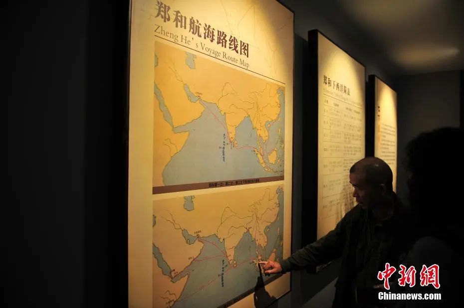 圖為觀(guān)眾在鄭和紀(jì)念館內(nèi)觀(guān)看鄭和航海線(xiàn)路圖。中新社記者 劉冉陽(yáng) 攝