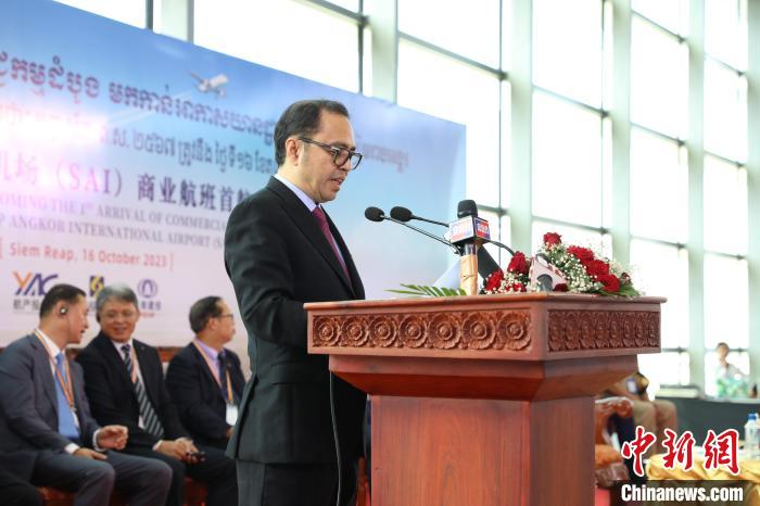 10月16日,柬埔寨暹粒吳哥國(guó)際機(jī)場(chǎng)通航運(yùn)營(yíng)。圖為柬埔寨副首相兼內(nèi)閣辦公廳大臣翁賽維索在首航儀式上致辭 (黎海月 攝)