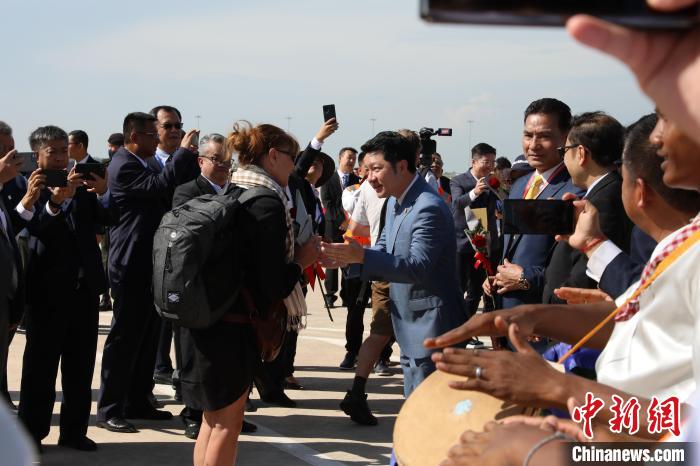 10月16日,柬埔寨暹粒吳哥國(guó)際機(jī)場(chǎng)通航運(yùn)營(yíng)。圖為柬埔寨旅游部大臣宋速更為游客送上鮮花及祝福。(黎海月 攝)