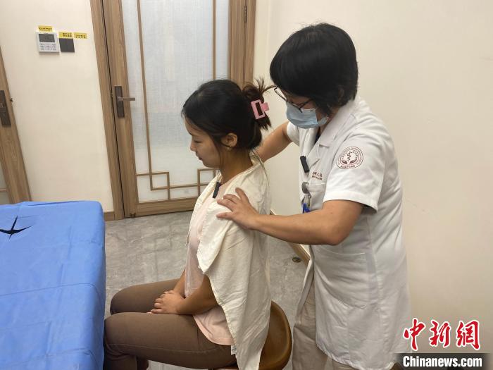 接下來許麗用手微微握拳,在記者左邊肩頸處反復(fù)做著“來回滾動(dòng)”的動(dòng)作?!斑@叫‘?法’,可以充分放松肌肉,它是一種柔和有力、剛?cè)岵?jì)的中醫(yī)推拿代表性手法?!痹S麗說,記者群體中,肩頸疼痛是最普遍的問題?!案邚?qiáng)度的工作會(huì)讓記者常感到頭暈、肩背酸脹,這時(shí)需要一定的肌肉放松才能消除不適感?!?/p>