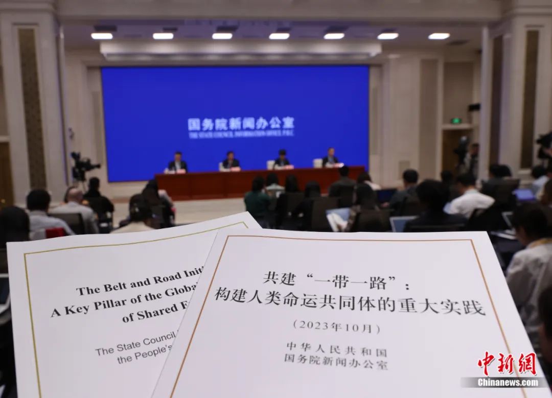 2023年10月10日,中國(guó)國(guó)務(wù)院新聞辦公室在北京舉行新聞發(fā)布會(huì),發(fā)布《共建“一帶一路”:構(gòu)建人類(lèi)命運(yùn)共同體的重大實(shí)踐》白皮書(shū)。楊可佳 攝