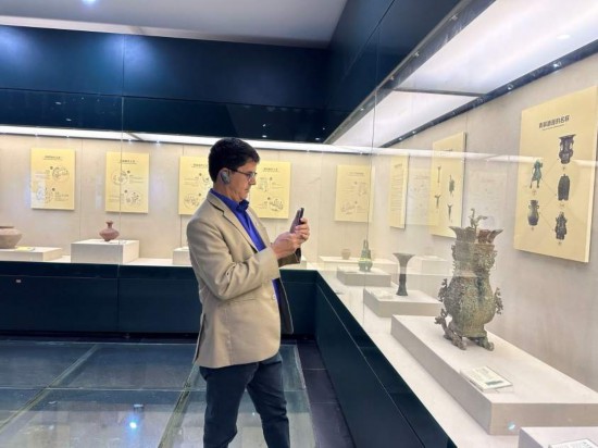 10月23日,2023“一帶一路”媒體合作論壇聯(lián)合采訪團(tuán)團(tuán)員在中國(guó)酒文化城認(rèn)真觀看展覽。本報(bào)記者 劉書(shū)文攝