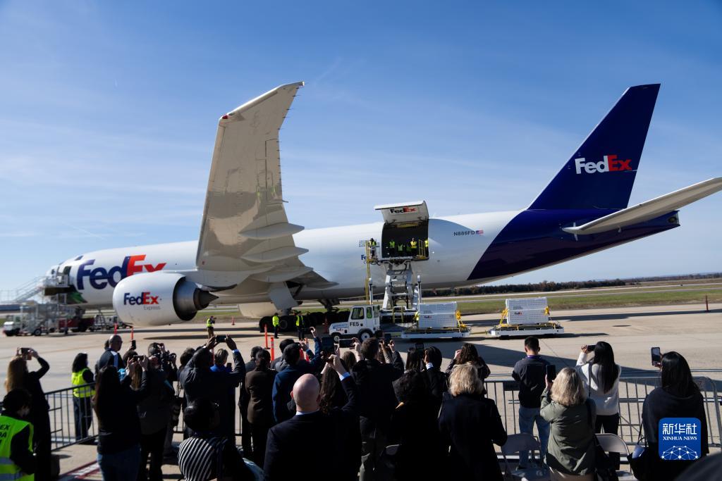 11月8日,運(yùn)送大熊貓的專機(jī)從美國弗吉尼亞州的華盛頓杜勒斯國際機(jī)場起飛。新華社記者劉杰攝